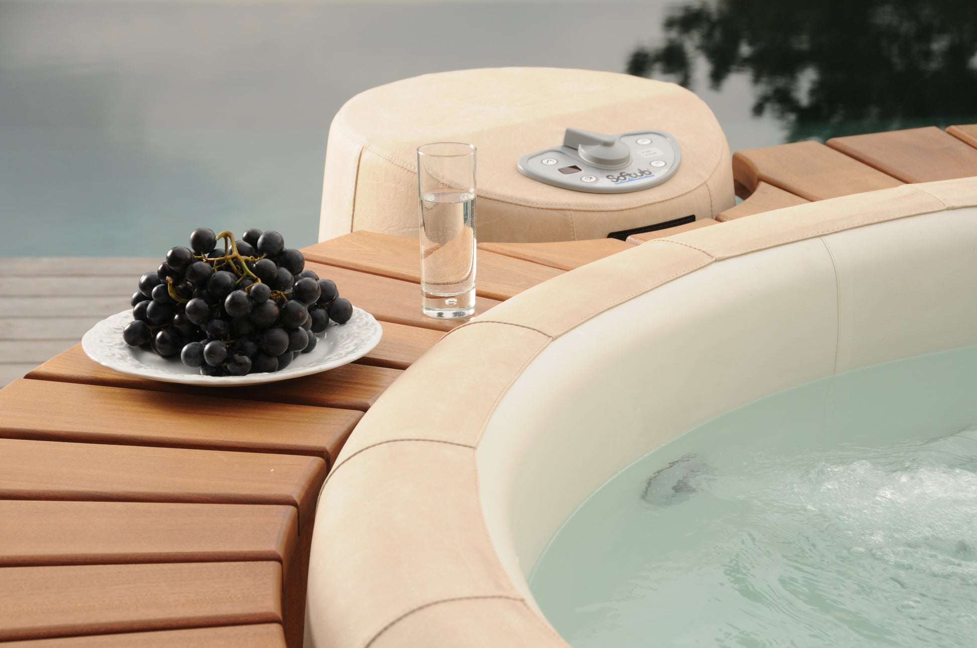 Encircle your Softub with a fun and functional hand-crafted cedar surround. It features a step to exit and easily enter your Softub and benches for you to sit on. Not only will you have a place to put accessories or a beverage, but you can also customize this surround to suit your backyard oasis by staining or painting it yourself.